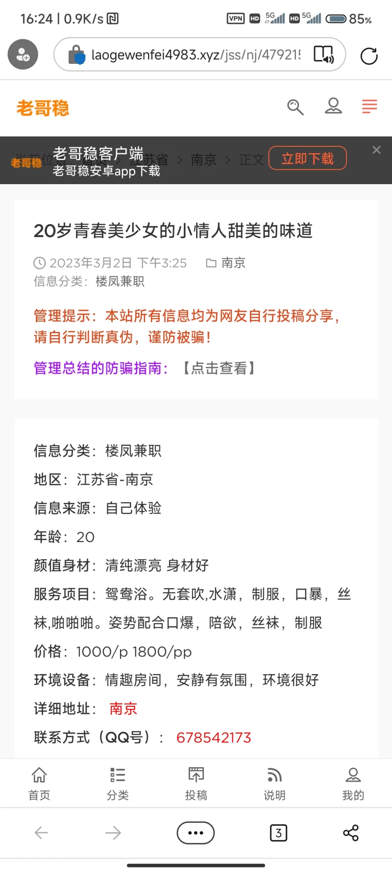 在老哥稳上找到的资源,说是1000/80分钟任意,我以为就是普通的个体兼职楼凤。到了地方遥控上去后,发现是个按摩店一样的地方,被告知1000元只有打飞机,要其他项目得购买vip或是价钱,我当时就知道被骗了,但是在他们的地盘我又没办法,只能当被宰了一千块了,就发个飞机,js连衣服都不脱,亏大了。